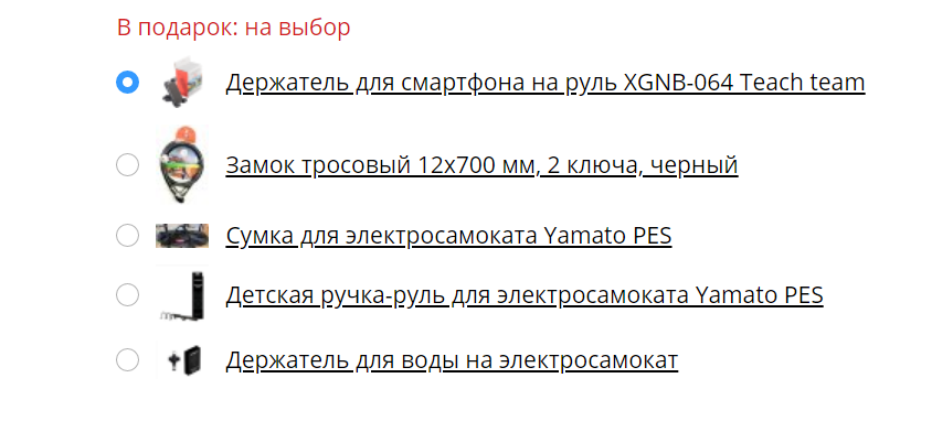 При покупке любого вида электротранспорта в Кемерове мы дарим в подарок нужные аксессуары. Перечень подарков вы можете увидеть в карточке товара.